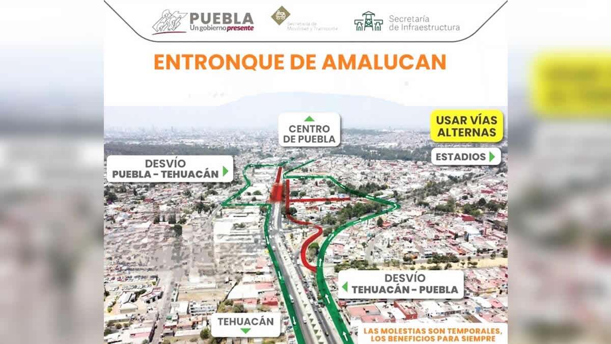 El secretario de Movilidad y Transporte, Omar Álvarez Arronte, anunció en la conferencia de prensa de gobierno este lunes, que habrá cierres totales en el entronque o distribuidor Amalucan, lo que provocará diversas afectaciones de circulación en la zona, por lo que la autoridad pide a la ciudadanía tomar precauciones y guiarse en las indicaciones de tránsito que habrá en dicha franja, a fin de evitar contratiempos.