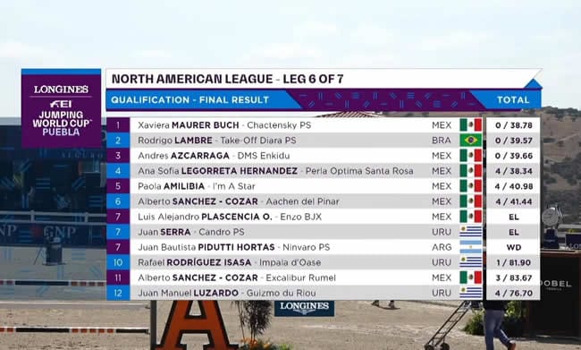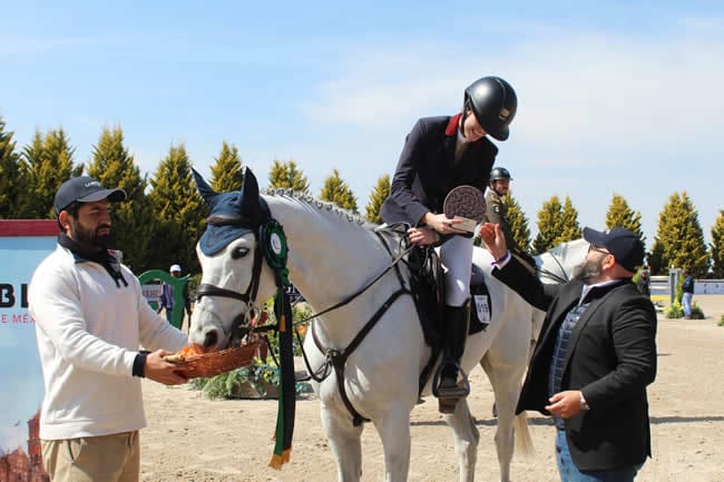 Un grato resultado para todos los connacionales que estuvieron presentes en la jornada de este jueves, fue el triunfo de la jinete mexicana Xaviera Maurer Buch y su caballo “Chactensky PS”, en la prueba de salto Cibrian de 1.50 metros libre, quien dominó increíblemente la difícil pista que se diseñó en el desempate, totalizando 38.78 segundos, y con ello vencer a dos titanes del hipismo en América, el brasileño Rodrigo Lambre montando a “Take off Diara” que se ubicó en segundo sitio con 39.57, y por sólo 9 centésimas más, el tercer sitio fue para el jinete mexicano que nos representó en las pasadas Olimpiadas de Francia, Andrés Azcárraga, montando a “DMS Enkidu” y cronómetro de 39.66 segundos.