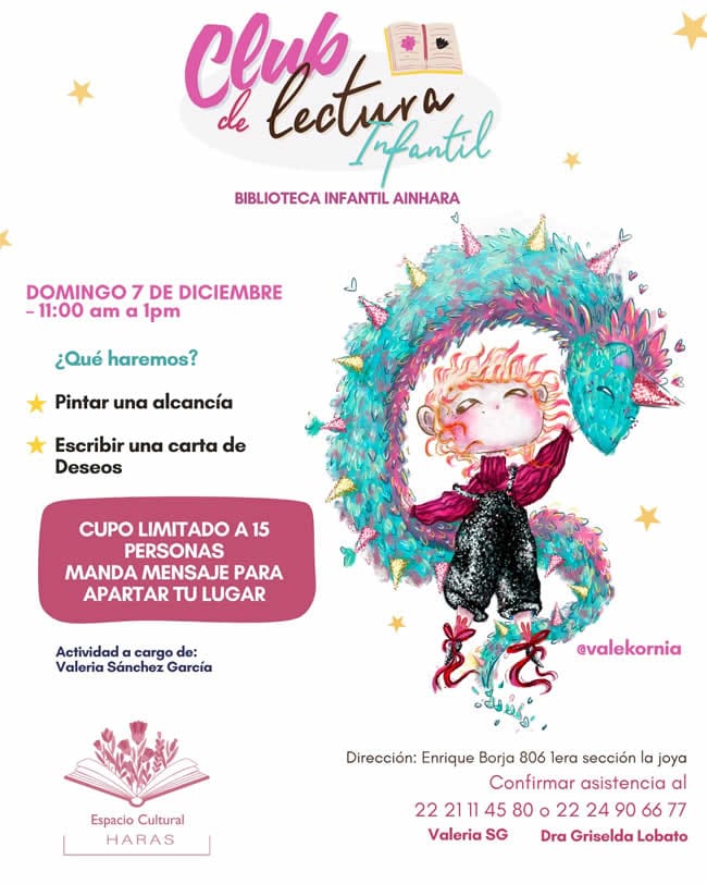 El Espacio Cultural Haras, tendrá actividad este domingo 7 de diciembre a partir de las 11 de la mañana, con quehaceres muy atractivos organizados por el Club de Lectura Infantil al frente de la talentosa Valeria Sánchez y la destacada maestra Ana Luisa Brocado.