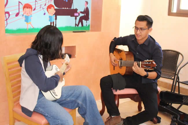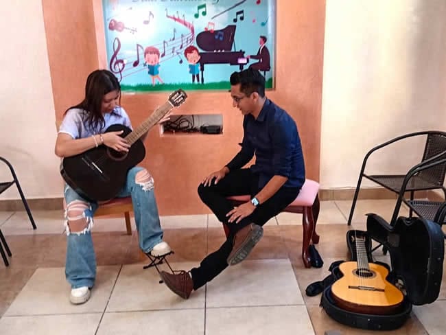 Un segmento de la enseñanza musical en el Espacio Cultural Haras está a cargo de José Jafet Pérez Fernández, quien ofrece clases de guitarra particulares y personalizadas durante los fines de semana, comenzando desde las 9 de la mañana los sábados y domingos.